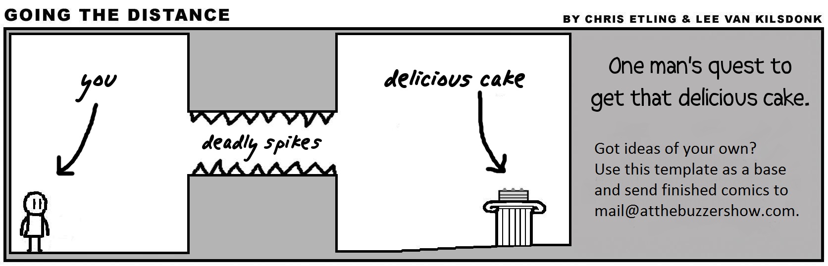 The basic idea is that you manipulate the base image here and show You’s attempt to get the cake. Maybe he tries to send a fishing rod through the spikes. Maybe he does a Mission Impossible trick from the ceiling. Maybe you mess with the frame of the strip itself. You’ll see an example tomorrow for what these ideas can look like.