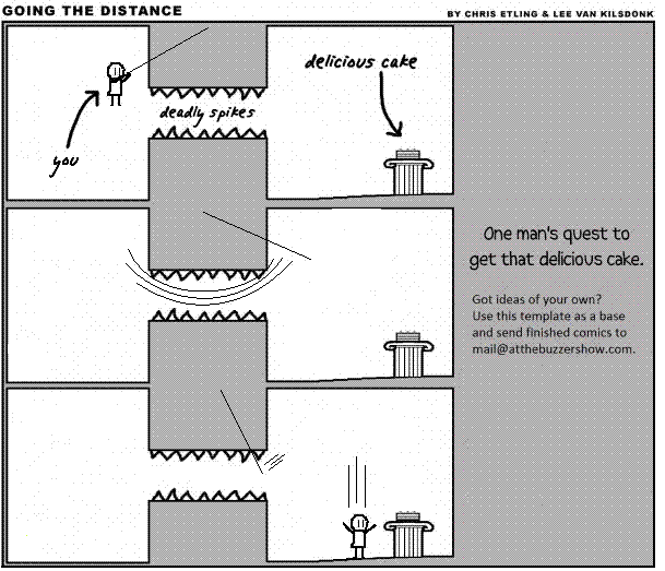 In Going the Distance, our main character, “You,” has to manage to make his way to delicious cake. Sounds simple, right? But there are deadly spikes to deal with, and a host of other problems that appear each time. Let’s just say You fails more often than You succeeds. After all, it wouldn’t be much of a quest if You could just get cake whenever You wanted, would it?
