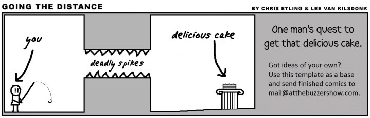 In Going the Distance, our main character, “You,” has to manage to make his way to delicious cake. Sounds simple, right? But there are deadly spikes to deal with, and a host of other problems that appear each time. Let’s just say You fails more often than You succeeds. After all, it wouldn’t be much of a quest if You could just get cake whenever You wanted, would it?