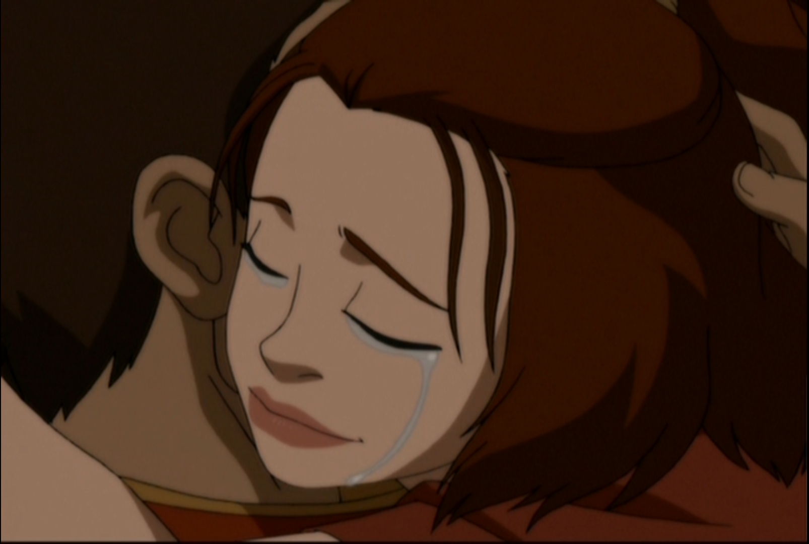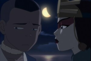 This brings us to Princess Yue, who Sokka meets when he and the Gaang reach the north pole. Despite being in engaged to another man through an arranged marriage, Yue and Sokka hit it off rather quickly, and she confesses that she has feelings for him. Yet she doesn’t want to abandon her people, and regretfully turns Sokka down. None of that really matters though, as soon after their heart-to-heart Yue sacrifices herself in order to become the new Moon Spirit, after the previous one was murdered, an action that would have left the worlds (both physical and spiritual) in imbalance and potentially thrown everything into chaos. Yue had been saved by the Moon Spirit as a child, and as such it was up to her and only her to save it by giving back the gift of life she received as a child. Sokka takes the whole thing pretty well, all things considered. I mean it isn’t every day that your girlfriend turns into the moon. And frankly, how does one handle that?