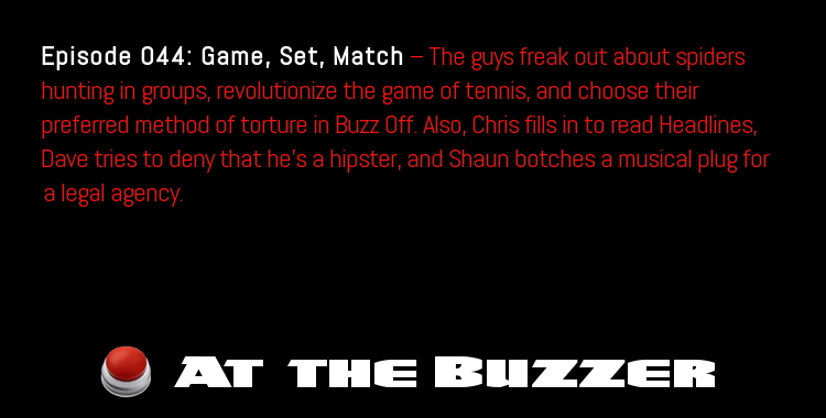 Episode 44: Game, Set, Match — The guys freak out about spiders hunting in groups, revolutionize the game of tennis, and choose their preferred method of torture in Buzz Off. Also, Chris fills in to read Headlines, Dave tries to deny that he’s a hipster, and Shaun botches a musical plug for a legal agency.