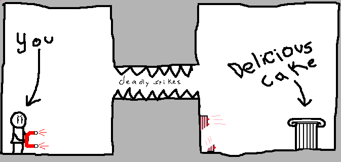 In Going the Distance, our main character, “You,” has to manage to make his way to delicious cake. Sounds simple, right? But there are deadly spikes to deal with, and a host of other problems that appear each time. Let’s just say You fails more often than You succeeds. After all, it wouldn’t be much of a quest if You could just get cake whenever You wanted, would it?
