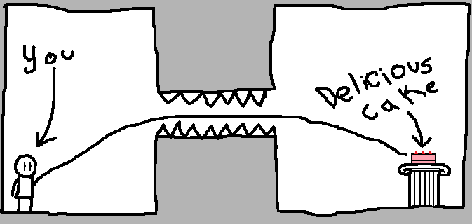 In Going the Distance, our main character, “You,” has to manage to make his way to delicious cake. Sounds simple, right? But there are deadly spikes to deal with, and a host of other problems that appear each time. Let’s just say You fails more often than You succeeds. After all, it wouldn’t be much of a quest if You could just get cake whenever You wanted, would it?