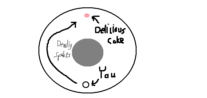 In Going the Distance, our main character, “You,” has to manage to make his way to delicious cake. Sounds simple, right? But there are deadly spikes to deal with, and a host of other problems that appear each time. Let’s just say You fails more often than You succeeds. After all, it wouldn’t be much of a quest if You could just get cake whenever You wanted, would it?