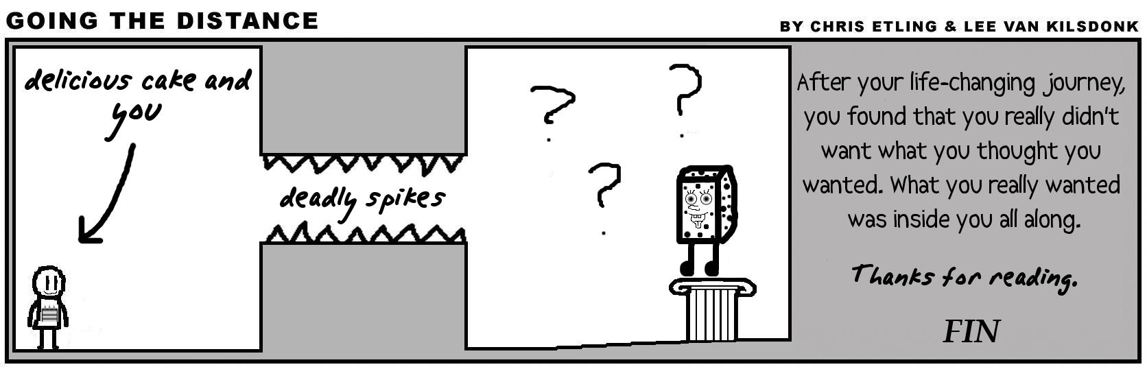 In Going the Distance, our main character, “You,” has to manage to make his way to delicious cake. Sounds simple, right? But there are deadly spikes to deal with, and a host of other problems that appear each time. Let’s just say You fails more often than You succeeds. After all, it wouldn’t be much of a quest if You could just get cake whenever You wanted, would it?