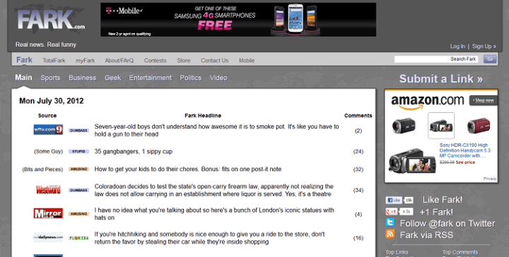Fark was started before the turn of the millennium, but it really started to take off a few years ago. It’s essentially a news aggregate that pulls together user submissions for the most interesting headlines on the Web. Fark sorts those into useful categories (like Sports and Business) and tags (like Stupid and Florida) and adds a minimalist comment system to each link. And…that’s about it.