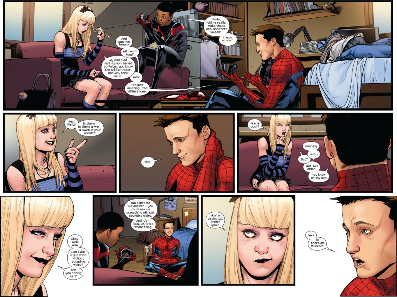 That isn’t to say that May doesn’t get her fair share of page space those. I’d be lying if I said it wasn’t touching when she looked Peter in the eyes and, after asking him if there was a May and Ben in his life, finally realized that this was indeed the same boy (albeit grown up) she’s loved and raised. A scene that eventually reaches its climax as, when Peter and Miles leave the Parker home at the end of the issue, she tells herself that she “Made the right choices.” Gwen, of course, just replies with “Well I’m writing a book!”