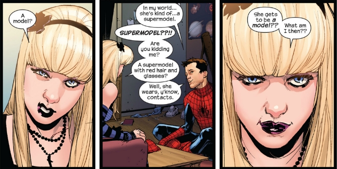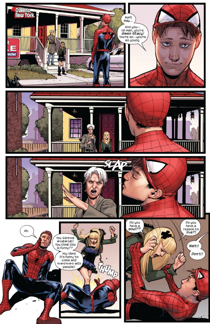 Issue 4 of Spider-men picks up right where issue 3 left off, Peter, outside of the Parker home, staring at a very confused May Parker and Gwen Stacy. As you might expect, the two of them don’t really appreciate someone standing on their lawn dressed as their recently deceased family member. So things go about as “well” as you’d expect…