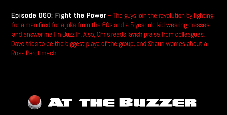 Episode 60: Fight the Power — The guys join the revolution by fighting for a man fired for a joke from the 60s and a 5-year-old kid wearing dresses, and answer mail in Buzz In. Also, Chris reads lavish praise from colleagues, Dave tries to be the biggest playa of the group, and Shaun worries about a Ross Perot mech.