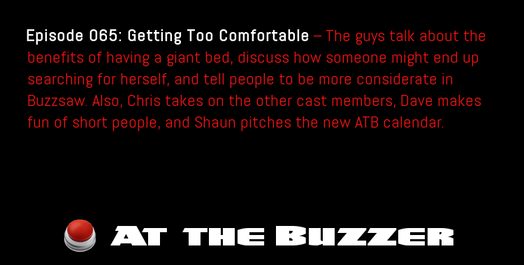 Episode 65: Getting Too Comfortable — The guys talk about the benefits of having a giant bed, discuss how someone might end up searching for herself, and tell people to be more considerate in Buzzsaw. Also, Chris takes on the other cast members, Dave makes fun of short people, and Shaun pitches the new ATB calendar.