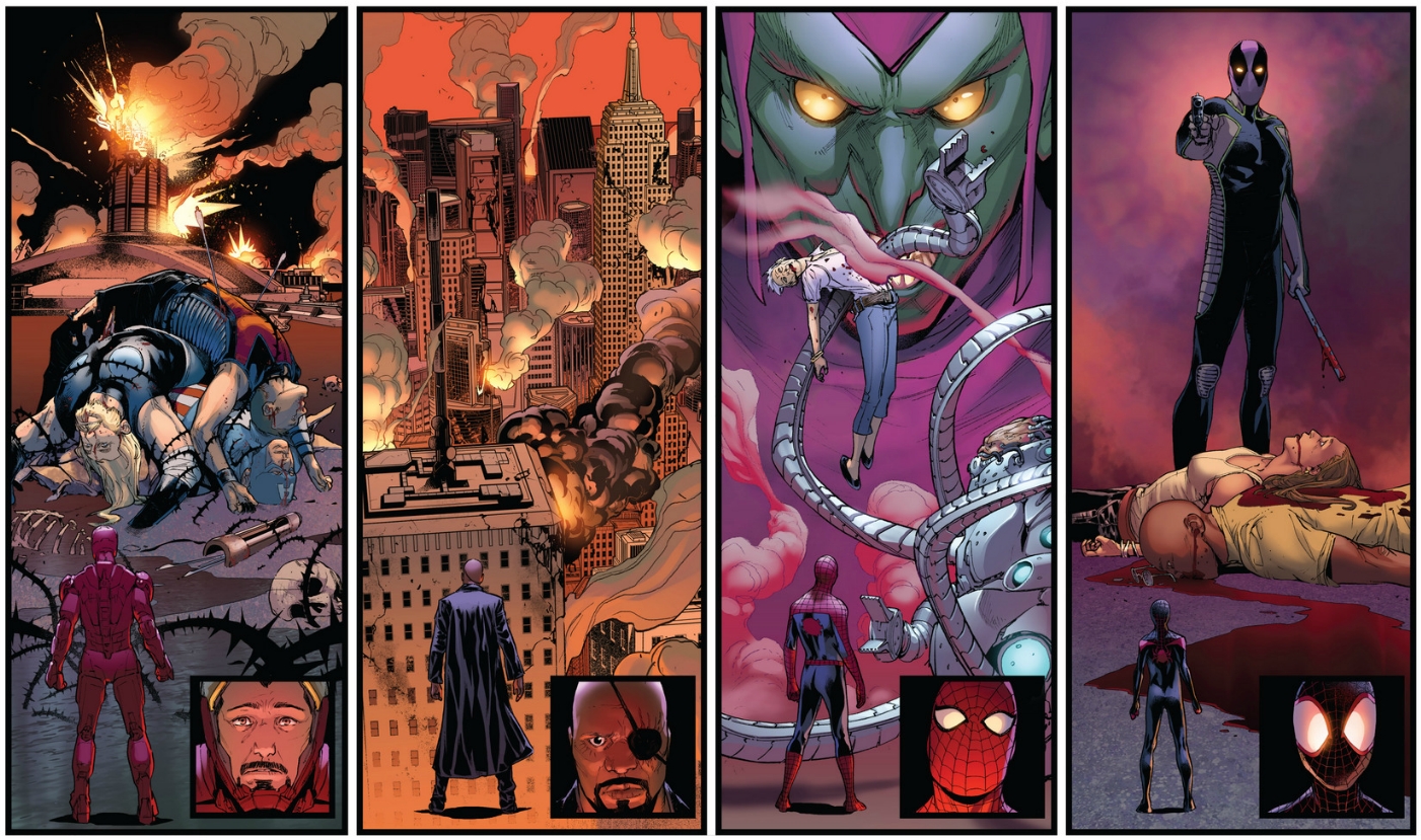 Of course, opening the portal just gets him dragged right out onto the other side, and smack dab in front of both Spider-men and the Ultimates (or at least what’s left of them these days). Mysterio refuses to go down though, and manages to break away from his captures just long enough to cause a few explosions and dose them all with his pantented fear toxin. Which gives us one of the cooler 2-page spreads we’ve seen so far, featuring Tony Stark, Nick Fury, Peter Parker and Miles Morales all standing in front of their worst fears. Tony can’t stand the thought losing all of his friends and allies, Nick Fury is afraid that the world will burn in fire and chaos and both Spider-men are faced with their loved ones being brutally murdered by their arch-nemeses.
