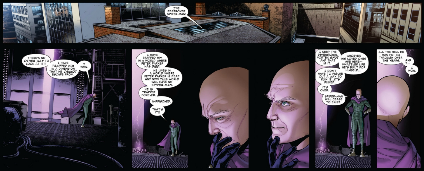Issue # 5 starts out with Mysterio being just as bitter and worried about the events that have happened so far that he, in his own typical fashion, shoots himself in the foot by re-opening the dimensional vortex that he really should have just left closed. “Just a peek,” he tells himself. “Just to make a plan.” A plan for what Mysterio? A way to gloat over Peter Parker, the man you’ve already beaten by trapping him in another dimension? He lets his ego get to him in a way that is so very much a comic villain move. Perfect for such a “second-rate” villain like himself, despite his arguing the contrary.