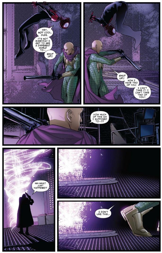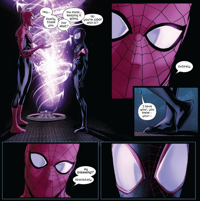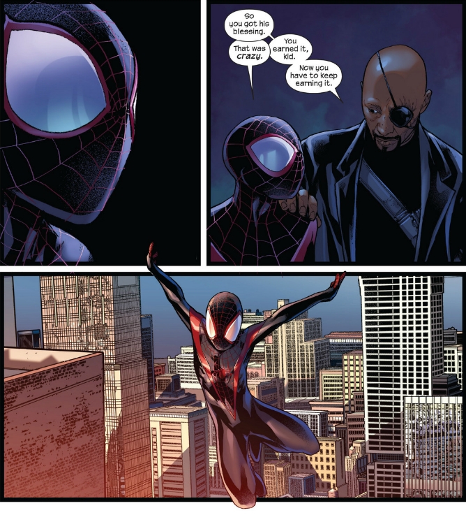From there things get moving pretty fast, as the portal begins to close and Peter has to head back to his own world ASAP. But not before giving Miles some advise (like never loaning anyone named Wolverine money) and, most importantly, giving Miles his blessing. That’s what this whole arc has been about people, Miles finally knowing that what he’s doing is the right thing to do. Sure, this technically isn’t the same Peter Parker that Miles has replaced, but it’s as close as Miles is ever going to get (barring some sort of serious magic BS). Miles now has the approval of not only Peter’s family, but of Peter Parker himself. Any fear or lingering doubt he might have had about whether or not he was in the right to take up the mantle of a dead High Schooler should all but be gone by now.