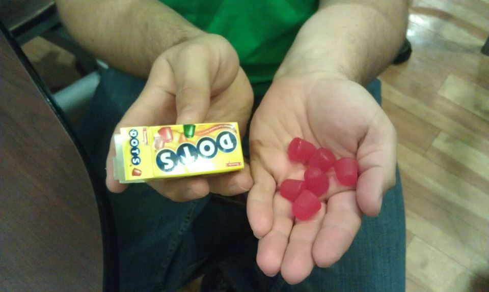 But one of those marks was special. It was the best mark in the world. I got a strike, so I grabbed the box of Dots, pretty much the best of the cheap Halloween candy. I tried to part the end of the box. It is common with this particular treat that you often times end up ripping the box in unusual ways, but this time it was simple, the flap separated itself cleanly, and a preemptive bliss started to sneak its way out.