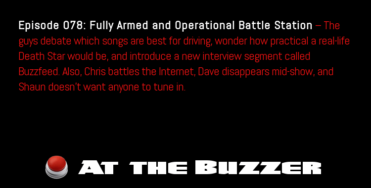 Episode 78: Fully Armed and Operational Battle Station — The guys debate which songs are best for driving, wonder how practical a real-life Death Star would be, and introduce a new interview segment called Buzzfeed. Also, Chris battles the Internet, Dave disappears mid-show, and Shaun doesn’t want anyone to tune in.