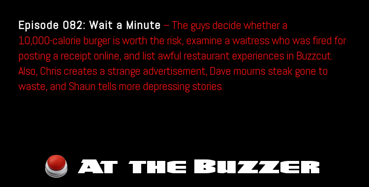 Episode 82: Wait a Minute — The guys decide whether a 10,000-calorie burger is worth the risk, examine a waitress who was fired for posting a receipt online, and list awful restaurant experiences in Buzzcut. Also, Chris creates a strange advertisement, Dave mourns steak gone to waste, and Shaun tells more depressing stories.