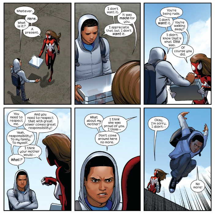 Although she wasn’t always in favor of Miles being Spider-Man, Jessica Drew has come to accept and support Miles as the “new” Spider-Man and is the first one we see really try to push Miles out of his year long absence. Miles has no idea who Jessica really is, or her relation to Peter, so to him she’s just another face trying to tell him how to live his life. He doesn’t respond too well to this, as you might imagine, and turns her down twice in the course of issue #23. Both on the roof of his school when she tries to hand him a briefcase and urges him to suit up again, and again when he finds the briefcase on his bed at his fathers house.