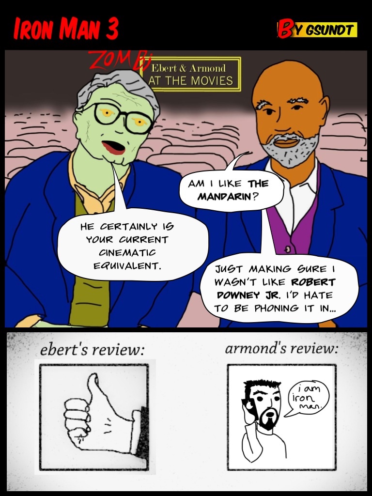Ebert & Armond IRON MAN 3: Reviewed by Ebert & Armond Zombiebert & Armond review Shane Black’s “Iron Man 3” Roger Ebert was the world’s best film critic. Armond White is it’s worst. And today they are reviewing Iron Man 3! Leave a comment below, and follow @Gsundt on Twitter for even more content! Rate this:Share this:Share Click to email a link to a friend (Opens in new window) Email Click to share on Facebook (Opens in new window) Facebook Click to share on X (Opens in new window) X Click to share on Reddit (Opens in new window) Reddit Click to share on Pinterest (Opens in new window) Pinterest Click to share on Tumblr (Opens in new window) Tumblr Like Loading... Related