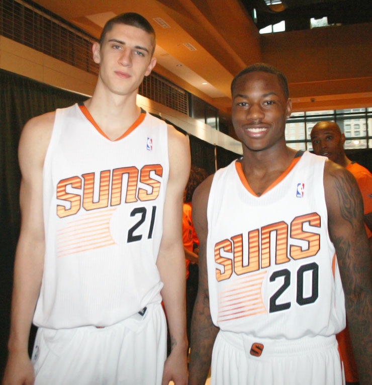 This article is titled “Why I Don’t Hate the Suns’ New Jerseys,” and yet all I’ve done is criticized to this point. I just wanted to shed light on the fact that I can sympathize with the hater’s dissatisfaction with the jerseys before claiming that I, personally, don’t think they’re all that bad. I think the design and font is very modern looking, crisp, and clean. I also love the heavily purple jerseys, and think the home whites are pretty neat looking as well. Let’s not talk abou the sleeved orange ones at this moment in time….
