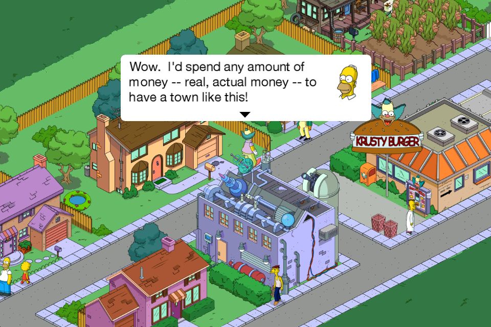 If there’s one downfall to this game, it’s the fact that it’s made by EA. EA owns the rights to all Simpsons video game media (as evidenced by the surprisingly excellent The Simpsons Game) and they will use any excuse to extract your hard earned money from you. Most games today have some sort of option to pay real dollars to help you along in the game or access premium content to make your town feel….well cooler I guess, I haven’t figured it out. In this game, donuts are the form of premium currency, as they have apparently been affected by the radiation of the nuclear blast to distort time and space. A player can use donuts to speed up the timing of a building or job, or to purchase a character or building that regular in-game money can’t buy. EA puts the opportunity to buy donuts everywhere, the items that donuts buy plentiful, and the opportunity to earn donuts virtually nonexistent. Of course it’s a free app, so people can get through without purchasing anything with real money, but it really drives someone crazy when they have to wait two days for a building to complete so you can move onto the next part of the mission.