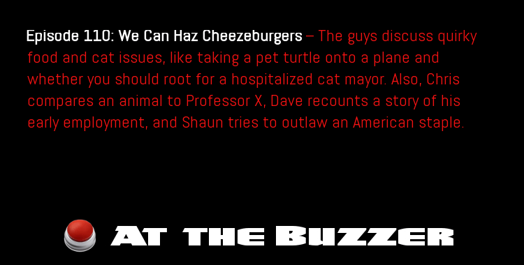 Episode 110: We Can Haz Cheezeburgers — The guys discuss quirky food and cat issues, like taking a pet turtle onto a plane and whether you should root for a hospitalized cat mayor. Also, Chris compares an animal to Professor X, Dave recounts a story of his early employment, and Shaun tries to outlaw an American staple.