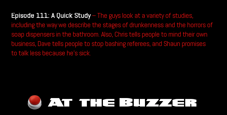 Episode 111: A Quick Study — The guys look at a variety of studies, including the way we describe the stages of drunkenness and the horrors of soap dispensers in the bathroom. Also, Chris tells people to mind their own business, Dave tells people to stop bashing referees, and Shaun promises to talk less because he’s sick.