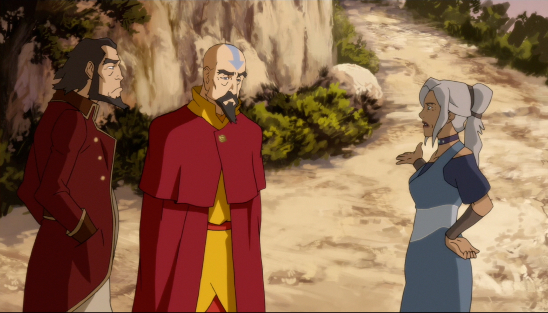 It was also refreshing to see the relationship between Aang’s children be as realistic as it was. Bumi, the non-bender, ends up with a sort of “Sokka-complex”; always joking around and trying to prove he can do anything a bender can do. And Kya, well, it would appear she inherited her fathers sense of wonder-lust; as she spent most of her life traveling the world before returning home to take care of a widowed Katara. I don’t know about you, but I loved seeing how multi-dimensional these character are. These aren’t just “Aang’s other kids”, these are fully fleshed out adults with just as much story and personality as Tenzin, the only child of Aang’s we got to meet in Season 1. I especially liked how this episode speaks directly to the fans in a way, reminding them that Tenzin isn’t the only decedent we should care about.
