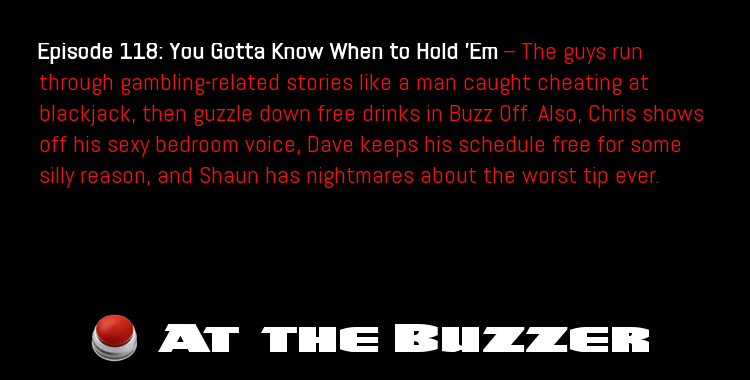 Episode 118: You Gotta Know When to Hold ‘Em — The guys run through a series of gambling-related stories like a man caught cheating at blackjack, then guzzle down free drinks in Buzz Off. Also, Chris shows off his sexy bedroom voice, Dave keeps his schedule free for some silly reason, and Shaun has nightmares about the worst tip ever.