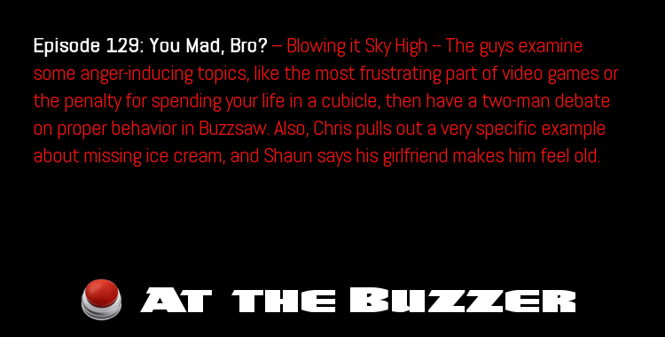 Episode 129: You Mad, Bro? — The guys examine some anger-inducing topics, like the most frustrating part of video games or the penalty for spending your life working in a cubicle, then have a two-man debate on proper behavior in Buzzsaw. Also, Chris pulls out a very specific example about missing ice cream, and Shaun talks about how his girlfriend makes him feel old.