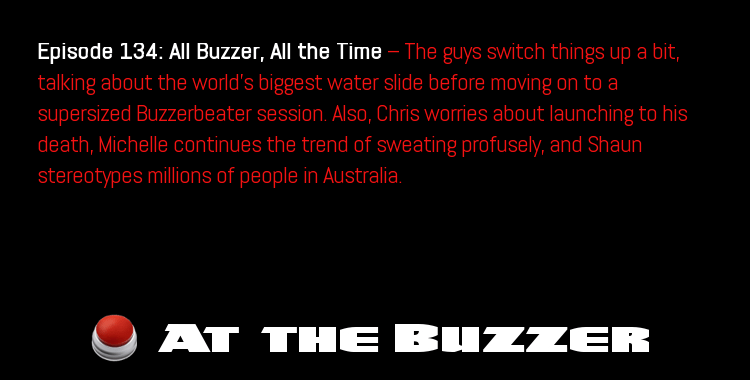 Episode 134: All Buzzer, All the Time — The guys switch things up a bit, talking about the world’s biggest water slide before moving on to a supersized Buzzerbeater session. Also, Chris worries about launching to his death, Michelle continues the trend of sweating profusely, and Shaun stereotypes millions of people in Australia.