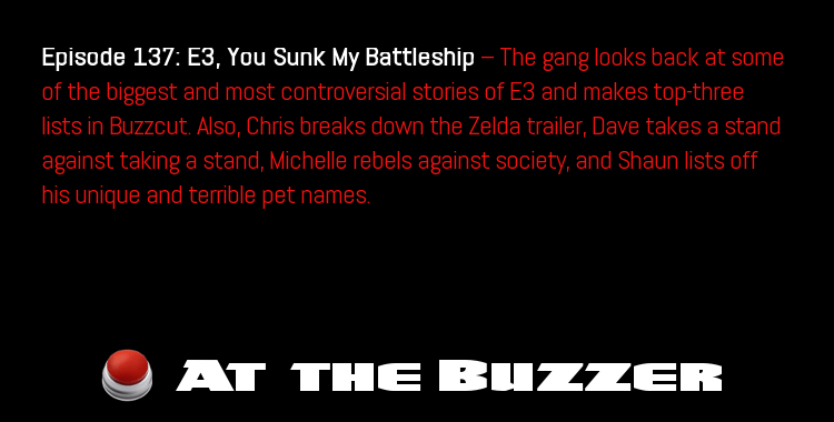 Episode 137: E3, You Sunk My Battleship — The gang looks back at some of the biggest and most controversial stories of E3 and makes top-three lists in Buzzcut. Also, Chris breaks down the Zelda trailer, Dave takes a stand against taking a stand, Michelle rebels against society, and Shaun lists off his unique and terrible pet names.
