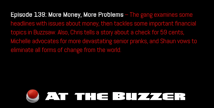 Episode 139: More Money, More Problems — The gang examines some headlines with issues about money, then tackles some important financial topics in Buzzsaw. Also, Chris tells a story about a check for 59 cents, Michelle advocates for more devastating senior pranks, and Shaun vows to eliminate all forms of change from the world.