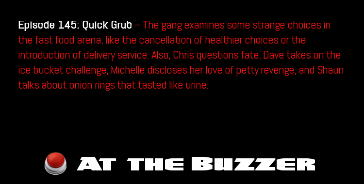 Episode 145: Quick Grub — The gang examines some strange choices in the fast food arena, like the cancellation of healthier choices or the introduction of delivery service. Also, Chris questions fate, Dave takes on the ice bucket challenge, Michelle discloses her love of petty revenge, and Shaun talks about onion rings that tasted like urine.