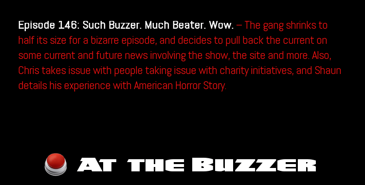 Episode 146: Such Buzzer. Much Beater. Wow. — The gang shrinks to half its size for a bizarre episode, and decides to pull back the current on some current and future news involving the show, the site and more. Also, Chris takes issue with people taking issue with charity initiatives, and Shaun details his experience with American Horror Story.