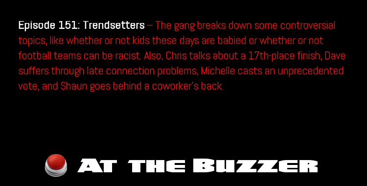Episode 151: Trendsetters — The gang breaks down some controversial topics, like whether or not kids these days are babied or whether or not football teams can be racist. Also, Chris talks about a 17th-place finish, Dave suffers through late connection problems, Michelle casts an unprecedented vote, and Shaun goes behind a coworker’s back.