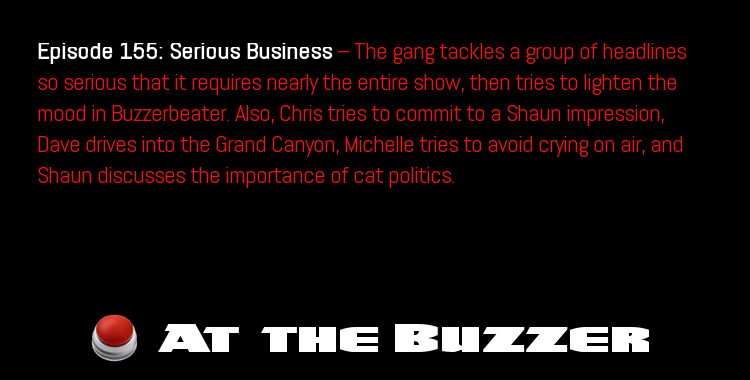 Episode 155: Serious Business — The gang tackles a group of headlines so serious that it requires nearly the entire show, then tries to lighten the mood in Buzzerbeater. Also, Chris tries to commit to a Shaun impression, Dave drives into the Grand Canyon, Michelle tries to avoid crying on air, and Shaun discusses the importance of cat politics.