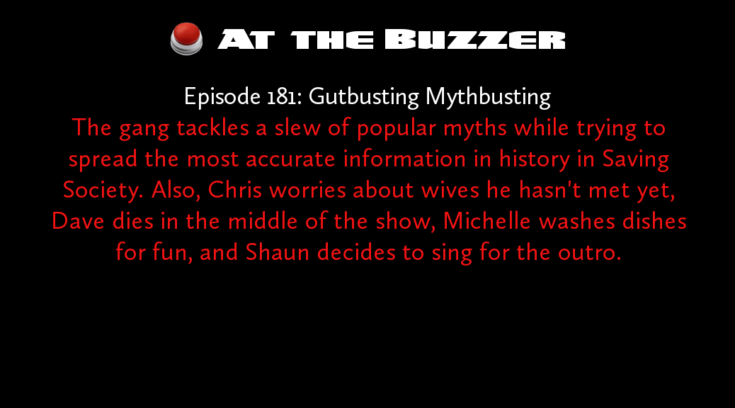 Episode 181: Gutbusting Mythbusting — The gang tackles a slew of popular myths while trying to spread the most accurate information in history. Also, Chris worries about wives he hasn’t met yet, Dave dies in the middle of the show, Michelle washes dishes for fun, and Shaun decides to sing for the outro.