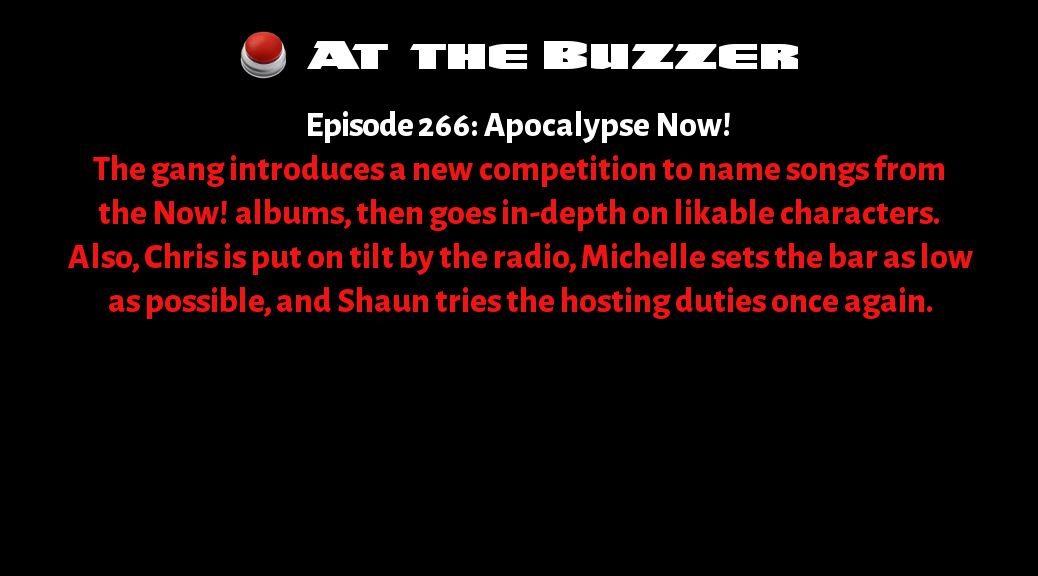 Episode 266: Apocalypse Now! — The gang introduces a new competition to name songs from the Now! albums, then goes in-depth on likable characters. Also, Chris is put on tilt by the radio, Michelle sets the bar as low as possible, and Shaun tries the hosting duties once again.
