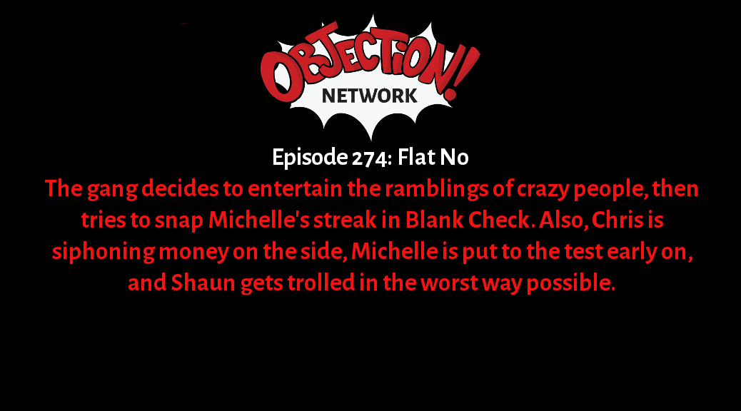 Episode 274: Flat No — The gang decides to entertain the ramblings of crazy people, then tries to snap Michelle’s streak in Blank Check. Also, Chris is siphoning money on the side, Michelle is put to the test early on, and Shaun gets trolled in the worst way possible.