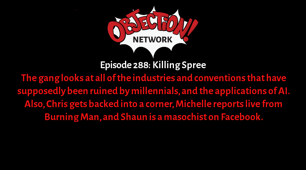 Episode 288: Killing Spree — The gang looks at all of the industries and conventions that have supposedly been ruined by millennials, and the applications of AI. Also, Chris gets backed into a corner, Michelle reports live from Burning Man, and Shaun is a masochist on Facebook.