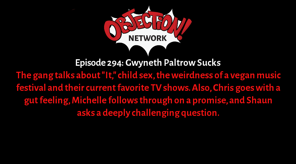 Episode 294: Gwyneth Paltrow Sucks — The gang talks about “It,” child sex, the weirdness of a vegan music festival and their current favorite TV shows. Also, Chris goes with a gut feeling, Michelle follows through on a promise, and Shaun asks a deeply challenging question.