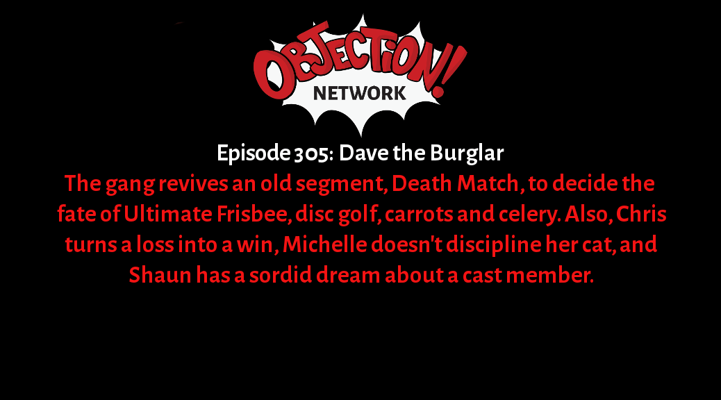 Episode 305: Dave the Burglar — The gang revives an old segment, Death Match, to decide the fate of Ultimate Frisbee, disc golf, carrots and celery. Also, Chris turns a loss into a win, Michelle doesn’t discipline her cat, and Shaun has a sordid dream about a cast member.