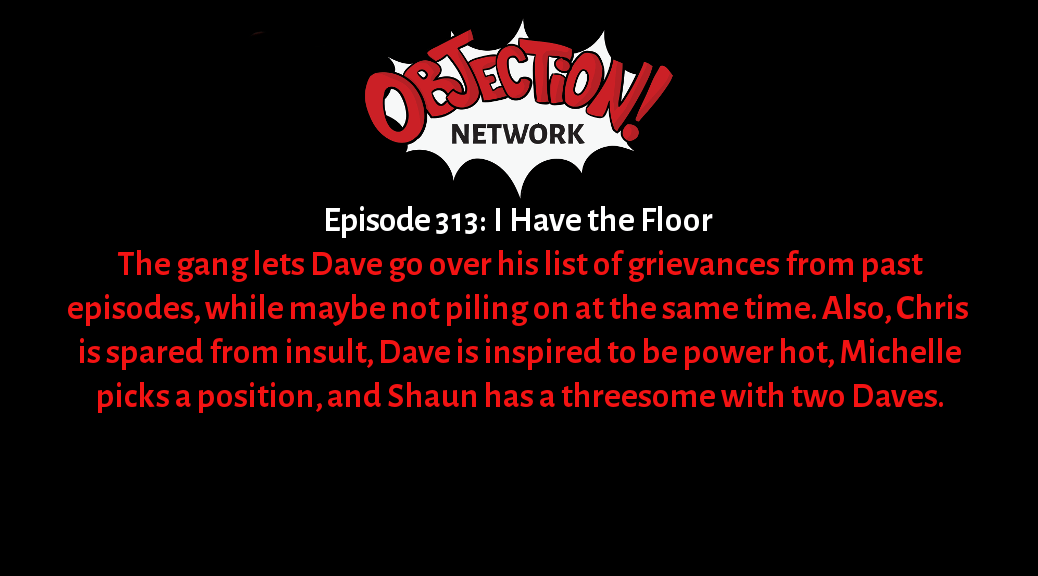 Episode 313: The Floor is Yours — The gang lets Dave go over his list of grievances from past episodes, while maybe not piling on at the same time. Also, Chris is spared from insult, Dave is inspired to be power hot, Michelle picks a position, and Shaun has a threesome with two Daves.