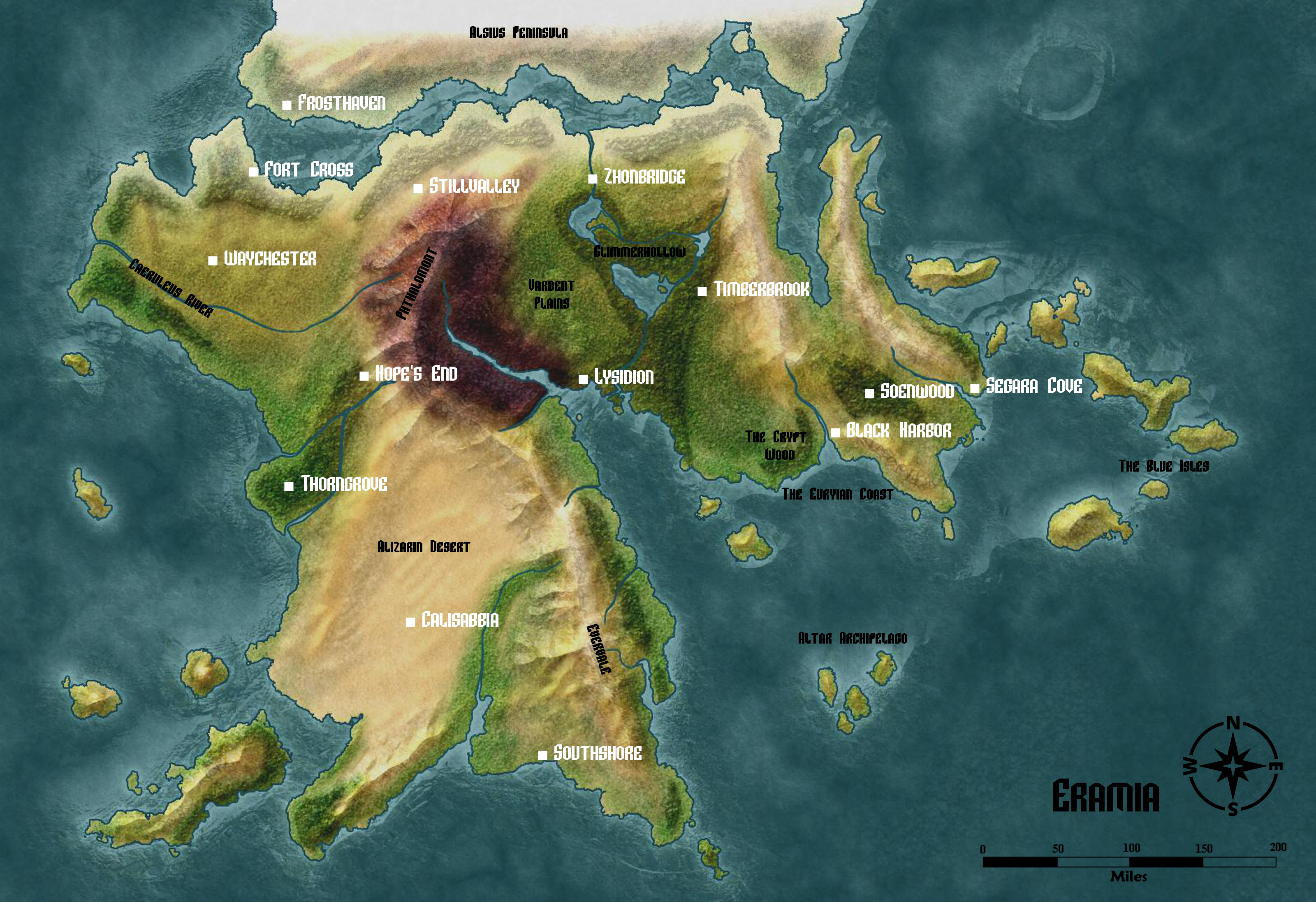 Editor’s note: The following is a list of major cities and locations in Eramia, the country where our D&D campaign takes place. For more information, click here. Click the map to enlarge.