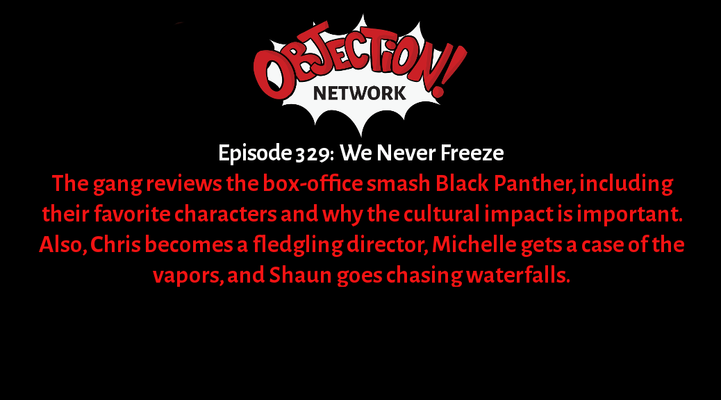 Episode 329: We Never Freeze — The gang reviews the box-office smash Black Panther, including their favorite characters and why the cultural impact is important. Also, Chris becomes a fledgling director, Michelle gets a case of the vapors, and Shaun goes chasing waterfalls.