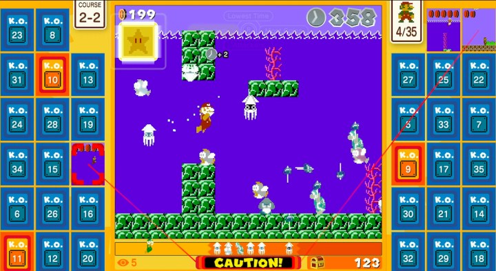 Made by the same folks who brought us Tetris 99, Mario 35 follows a familiar formula: you’re matched up against other players, and your goal is to eliminate them all battle royale style to be the last player standing. The layout is similar to T99 as well, with your screen taking up the middle third, and tiny versions of the other players surrounding it on both sides, along with some other information in the HUD.