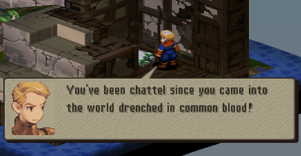 I particularly loved this line of dialogue from Ramza relatively early on in the game: “My birth was not of my choosing.” It perfectly illustrates the flaws of classism; not just the obvious ones on how the poor struggle to survive and are not seen as people, but the burden of family names and legacy. People should be judged based on the sum of their character and actions, not just their birthright. I have a feeling that I’ll be seeing more of Ramza coming to terms with that as the game progresses.