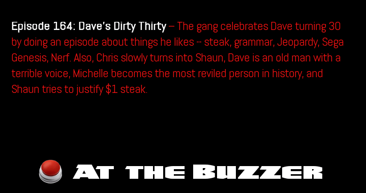 Episode 164: Dave’s DIrty Thirty — The gang celebrates Dave turning 30 by doing an episode about things he likes — steak, grammar, Jeopardy, Sega Genesis, Nerf. Also, Chris slowly turns into Shaun, Dave is an old man with a … Continue reading At the Buzzer (01/15/15)