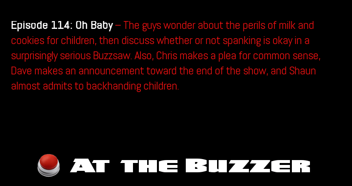 Episode 114: Oh Baby — The guys wonder about the perils of milk and cookies for children, then discuss whether or not spanking is okay in a surprisingly serious Buzzsaw. Also, Chris makes a plea for common sense, Dave makes … Continue reading At the Buzzer (10/10/13)