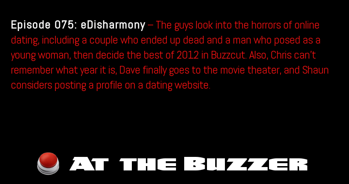 Episode 75: eDisharmony — The guys look into the horrors of online dating, including a couple who ended up dead and a man who posed as a young woman, then decide the best of 2012 in Buzzcut. Also, Chris can’t … Continue reading At the Buzzer (01/03/13)